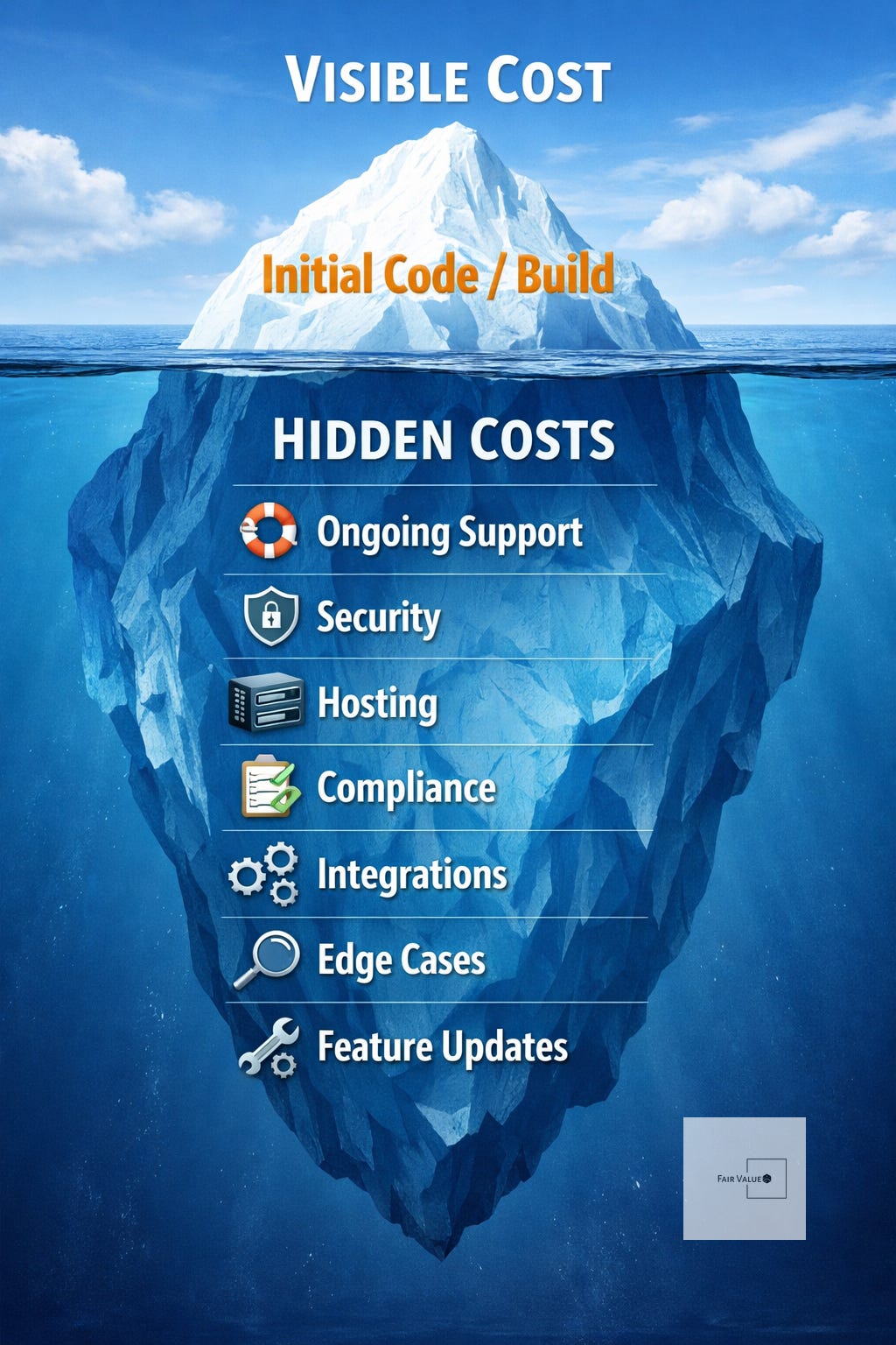 AI has dramatically reduced the cost of writing code. What it hasn’t reduced, at least not yet, is the cost of hosting, integrating, securing, supporting, and continuously improving software in a production environment. The first version is the visible tip of the iceberg. Everything beneath the waterline is where the real spend lives.
