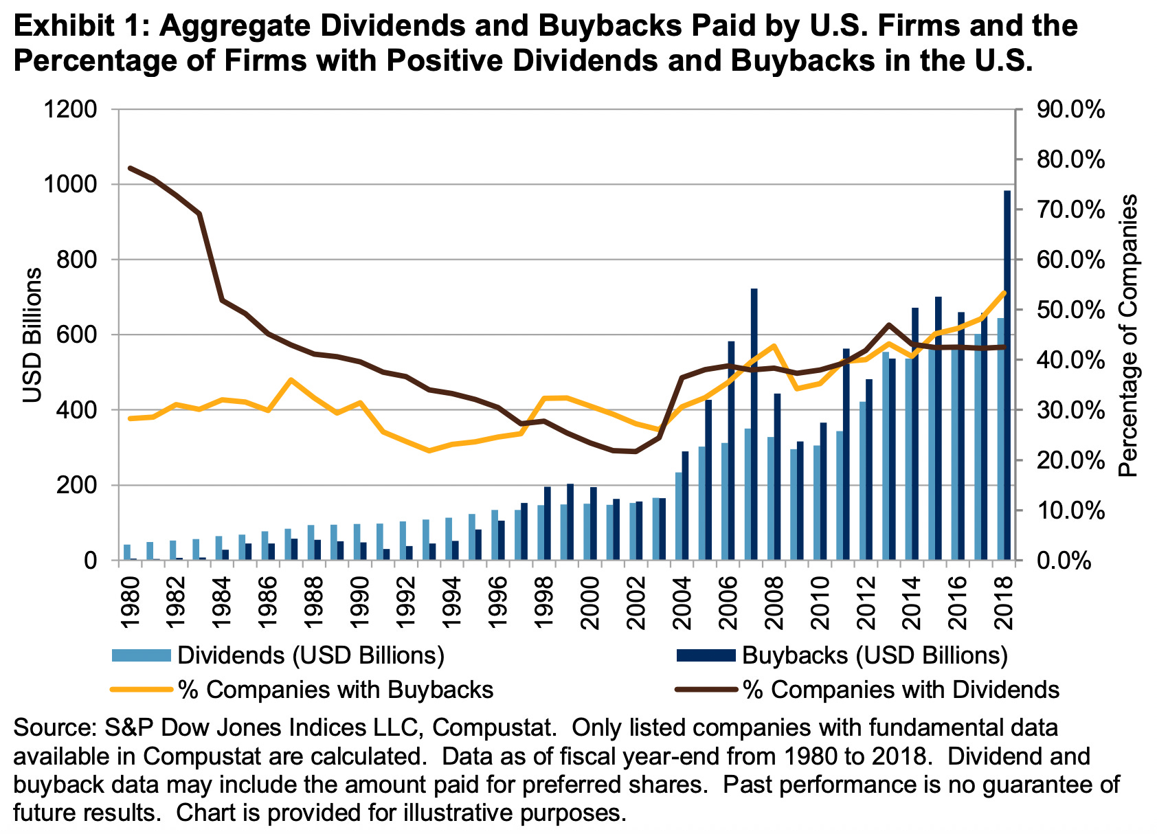 That drop isn’t about taxes; since 2003, qualified dividends and long-term capital gains have been taxed at roughly the same favorable rates. The deeper reason is corporate behavior: companies increasingly favor share repurchases over cash dividends. Buybacks are more flexible, often more tax-efficient, and allow management to support share prices without committing to a permanent payout. Also, cutting a dividend signals to investors weakness in the company, while a buyback is perceived as a one time event (executed over the course of months or years). In fact, S&P data shows that in many years since 2010, buybacks have outstripped dividends as the dominant form of cash return to shareholders.