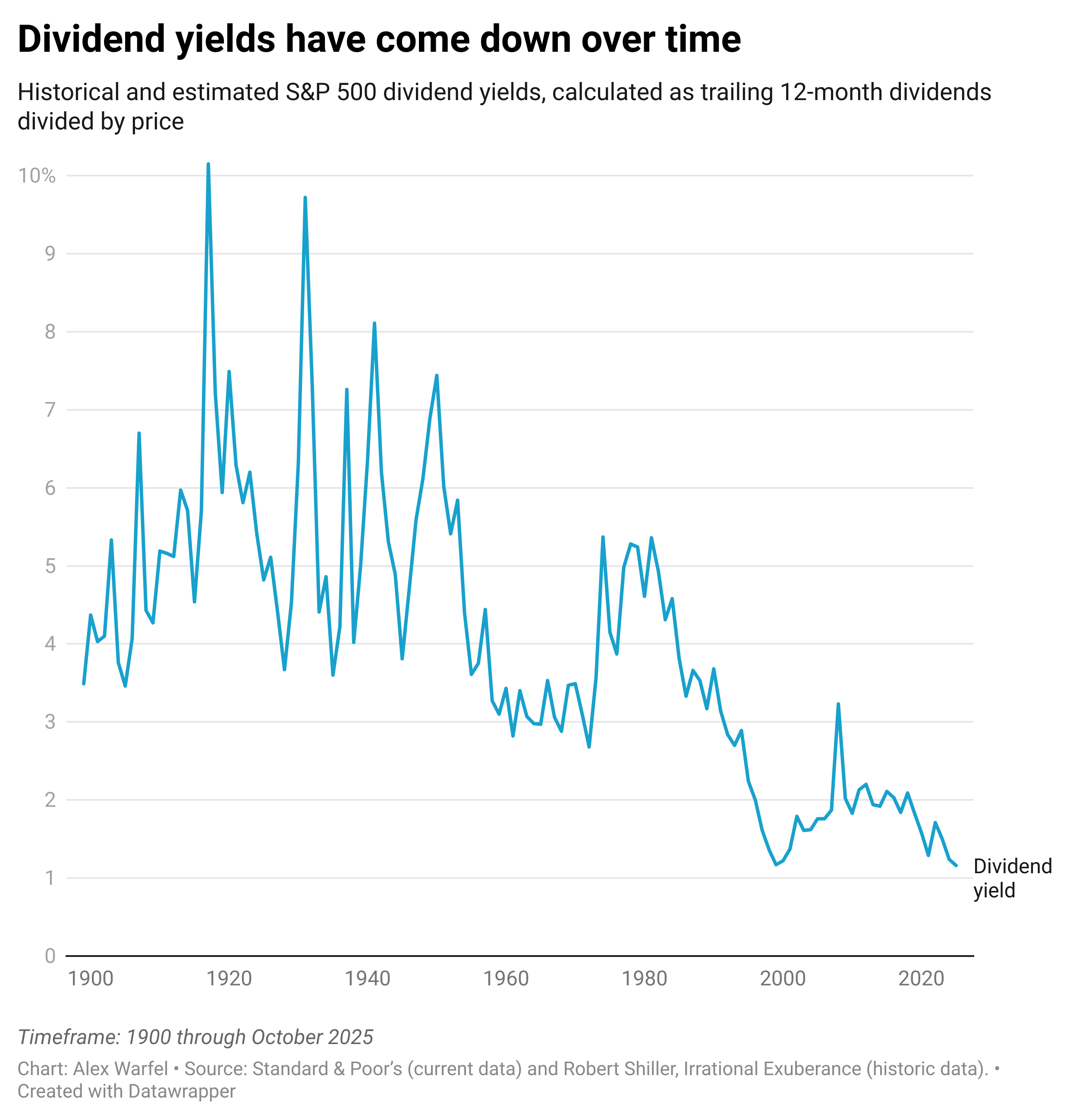 Take dividends, the bedrock of traditional valuation. These have faded as a guidepost. In the U.S., dividend yields have trended downward for nearly a century, falling from 5–6% in the early 20th century to under 2% today (Robert Shiller, Irrational Exuberance).