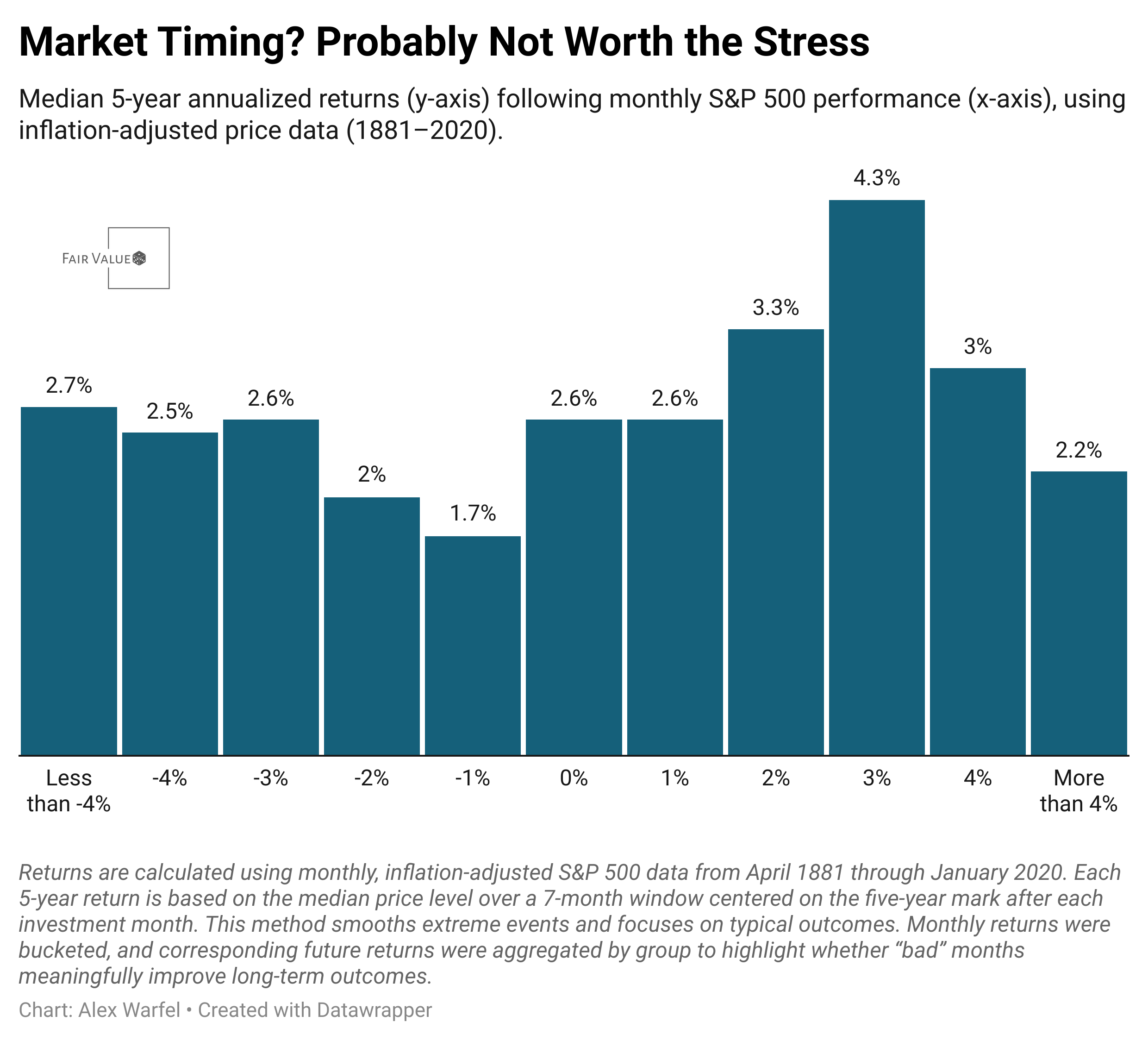 Chart of the week: The S&P 500’s strongest five-year returns followed modest 3% monthly gains—not major surges or crashes—challenging the idea that market timing is essential.