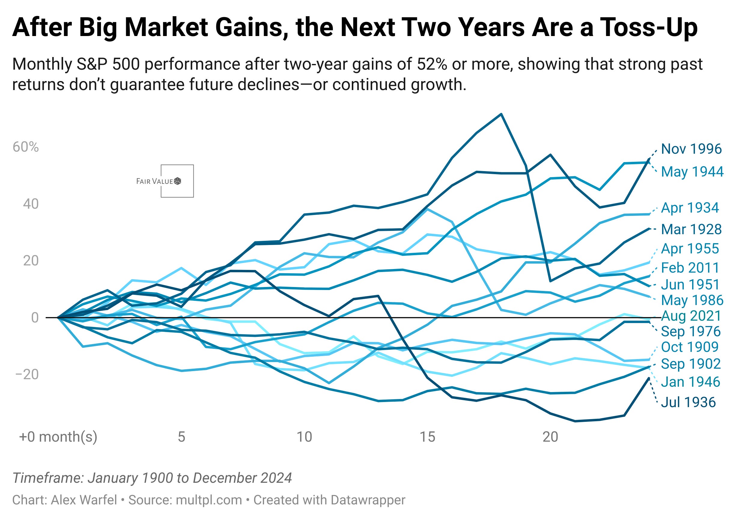 It’s easy to assume that after two years of strong stock market gains, the next two years must be rough. This belief comes from the idea of mean reversion, which suggests that everything eventually returns to its historical average. But in finance, this isn’t always true. Research from Dimson, Marsh, and Staunton (2019) shows that stock markets don’t follow a predictable pattern of boom and bust. While periods of extreme overvaluation can lead to corrections, markets can also continue rising if investor confidence, earnings growth, and economic conditions support higher prices. Looking at past S&P 500 data, after two-year gains of 52% or more, returns in the following 24 months have been all over the place—sometimes strong, sometimes weak, and sometimes flat. Why did I choose 52% as the benchmark, that is how much the S&P 500 has returned since February 2023. The key takeaway? Past performance alone doesn’t tell us what will happen next.