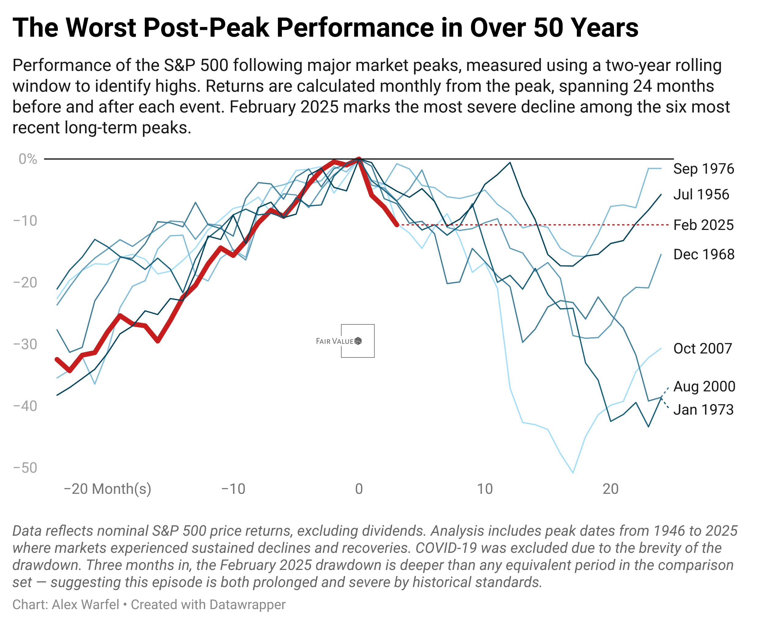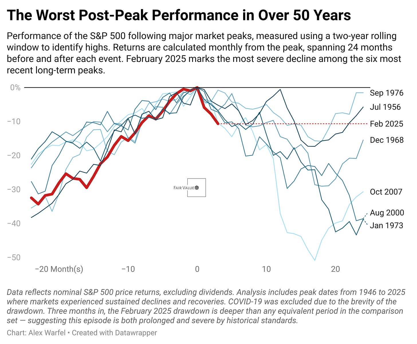 Chart of the Week: The current market downturn since February 2025 is already the worst post-peak performance of the S&P 500 in over 50 years, largely driven by uncertainty around the Trump administration’s tariff policies.