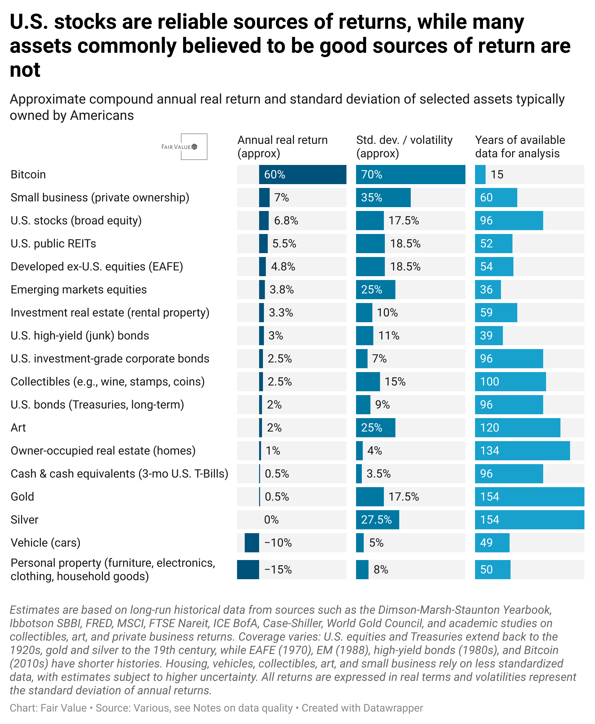 At first glance, Bitcoin looks like a clear winner for asset appreciation. But with only about 15 years of reliable data, we don’t yet have enough history to judge its long-term returns. Its volatility is extremely high, making it a bad place to commit a large share of net worth until it’s tested across more market cycles. My rule of thumb here is that 30 years of data is needed to evaluate how an asset performs under different economic conditions.