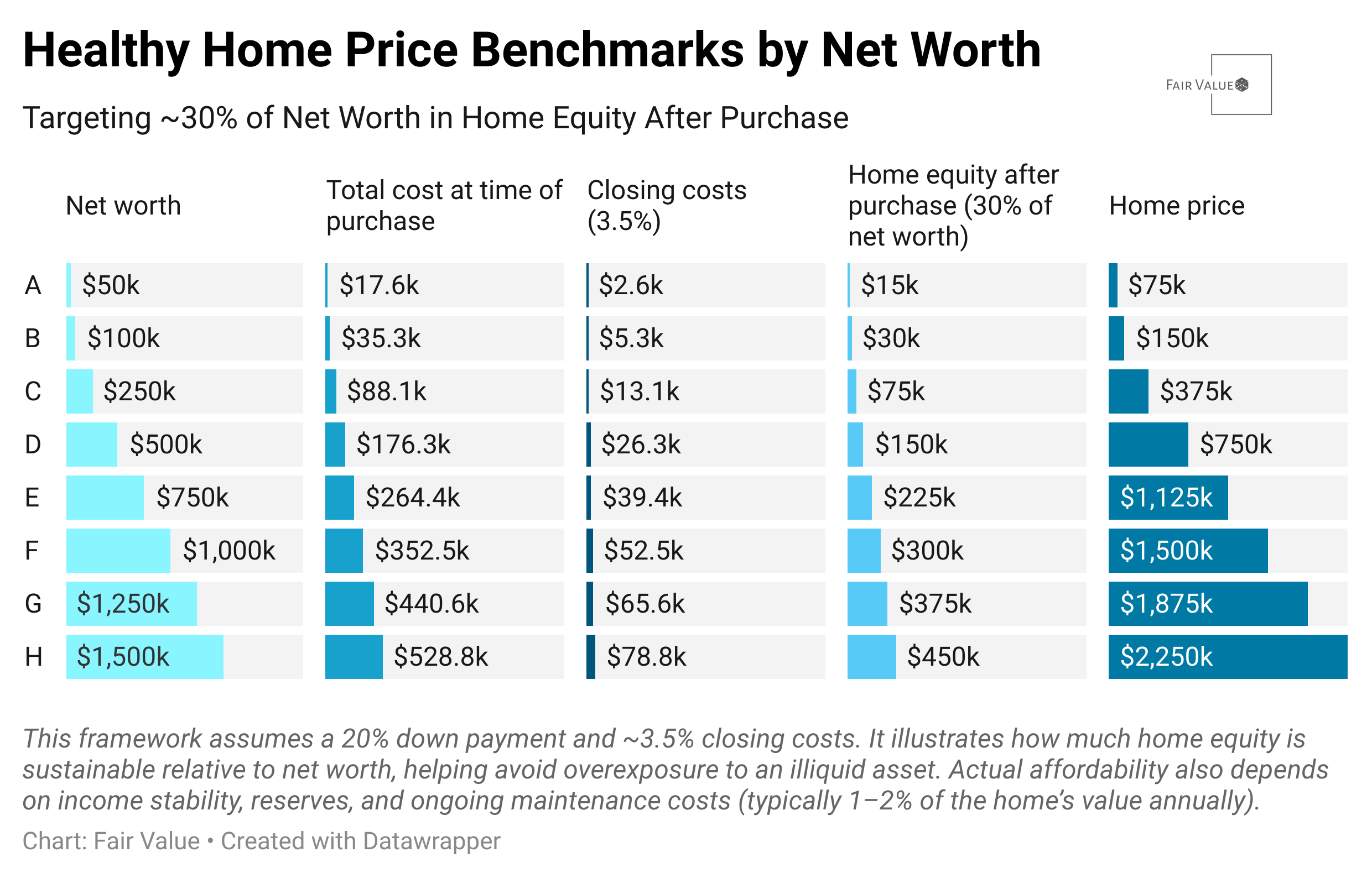 So bringing this back to large purchases, the real goal isn’t just figuring out what monthly mortgage you can afford, it’s deciding how much of your net worth you want locked into a house versus left working in higher-return assets. A simple rule of thumb is to cap housing at around 30% of your net worth. So, if you have $1M, that means about $300K could be in home equity. With closing costs factored in, that $300K roughly covers a 20% down payment, which points you toward homes worth about $1.5M. The exact percentages depend on your financial goals, but the principle is the same: set your target allocation first, then let the math tell you the price range you should be shopping in. Think of the numbers not as rules, but as guardrails that keep you from overextending.