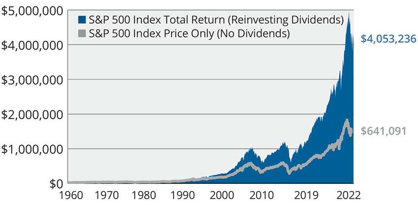 You’ll often see charts like below, but what this chart is missing is a line that shows just the growth of reinvested dividends without the capital appreciation component. If you remove a source of return over a long enough time period the differences will look extreme due to compounding.