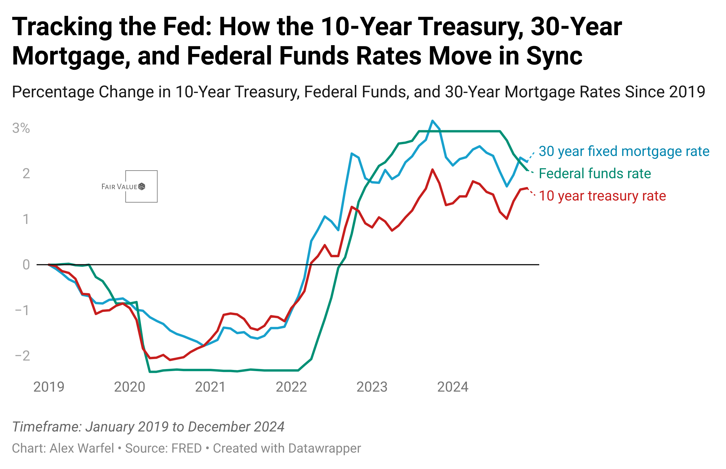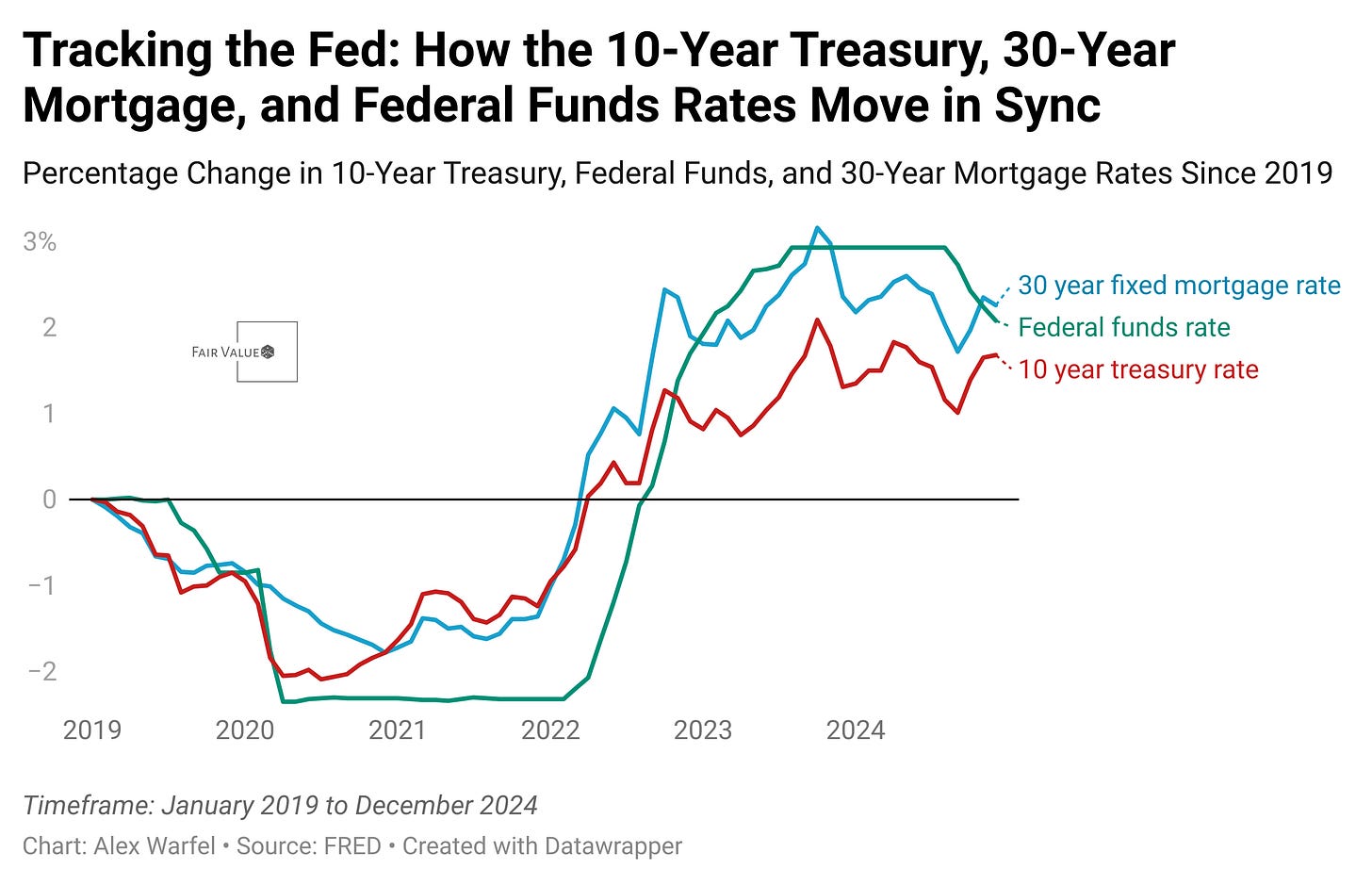 Chart of the week: Interest Rates Are Highly Connected - The federal funds rate influences Treasury yields and mortgage rates, meaning Fed policy decisions directly impact borrowing costs for homebuyers and businesses.