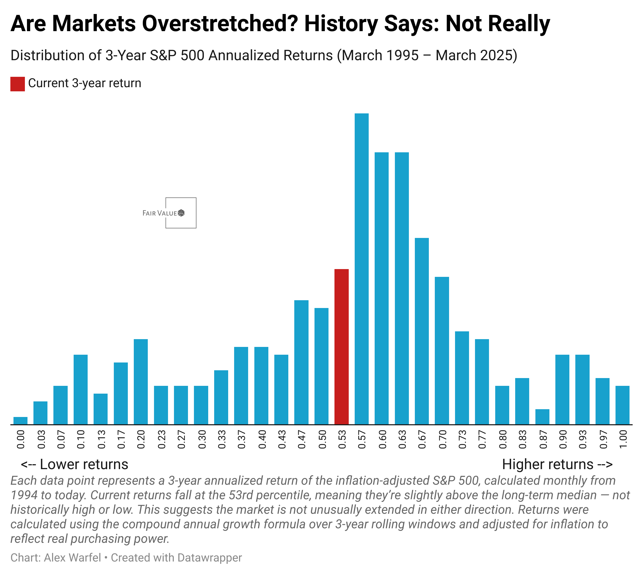 This chart shows the distribution of 3-year, inflation-adjusted annualized returns for the S&P 500, calculated monthly from March 1995 through March 2025. By using rolling 3-year windows and adjusting for inflation, the analysis focuses on real purchasing power — not just nominal gains. That’s a critical distinction when assessing whether the market is “overextended” or “undervalued” in a historical sense. Investors don’t spend nominal returns; they spend real ones. So to understand whether today’s market outcomes are strong, weak, or typical, it makes sense to anchor that judgment in after-inflation results. The data shows current real returns at the 53rd percentile — slightly above the long-term median — suggesting markets are neither frothy nor cheap by historical standards.